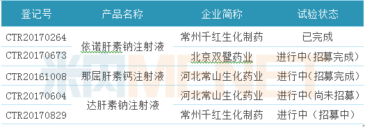 截至目前,一致性評價中準(zhǔn)備開展/已開展/已完成BE試驗的注射劑有5個登記號,涉及企業(yè)3家,品種3個。從進行試驗的企業(yè)看,常州千紅生化藥業(yè)、河北常山生化藥業(yè)均有2個產(chǎn)品處于試驗階段;從試驗的產(chǎn)品看,有2家藥企進行BE試驗的依諾肝素鈉注射液,深圳市天道醫(yī)藥已搶先一步,其產(chǎn)品已經(jīng)處于申報一致性評價的隊列。