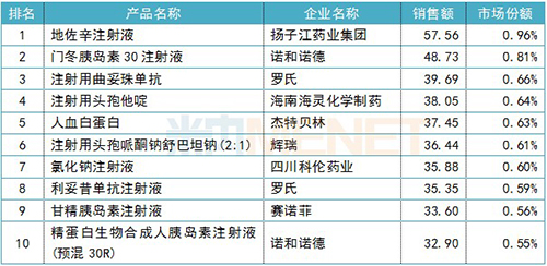 2018年中國(guó)公立醫(yī)療機(jī)構(gòu)終端化藥注射劑產(chǎn)品TOP10(單位:億元)