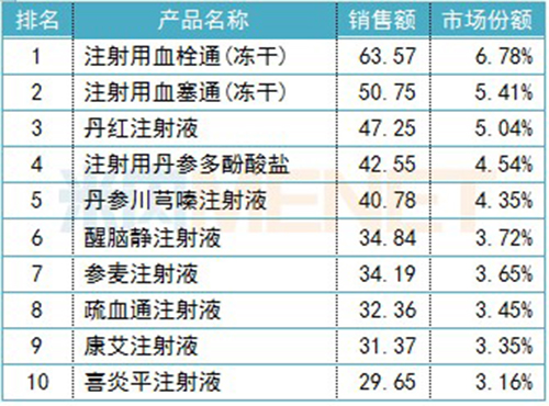 品牌TOP10銷售額均超過(guò)25億元,其中,梧州制藥(集團(tuán))的注射用血栓通(凍干)、山東丹紅制藥的丹紅注射液等7個(gè)是獨(dú)家品種。