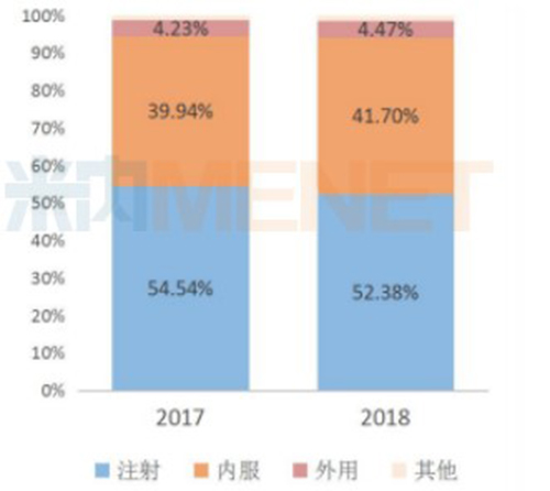 2017-2018年中國(guó)公立醫(yī)療機(jī)構(gòu)終端總體用藥途徑占比分布