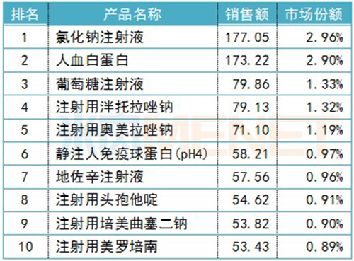 2018年產(chǎn)品TOP10銷售額超過(guò)800億元,市場(chǎng)份額合計(jì)達(dá)14%。產(chǎn)品TOP10中,氯化鈉注射液和人血白蛋白銷售額均超過(guò)百億規(guī)模,其余8個(gè)產(chǎn)品的銷售額也均超過(guò)50億元。